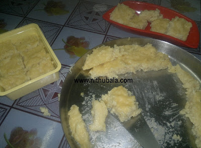 8. Grease a plate with a little ghee. Transfer the contents to the plate.